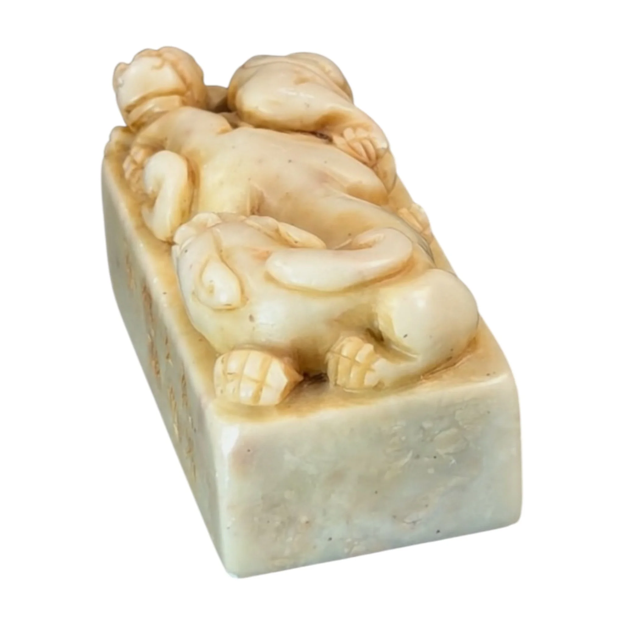A finely hand-carved seal in Shoushan stone, prized in China for scholar’s objects and seals. The waxy, matte surface and warm creamy tone are typical of the stone; the sculptor modelled a pair of Buddhist lions (shi) on the top. One side bears a light incised inscription; the base is carved in zhuanshu (seal script) and retains red paste.